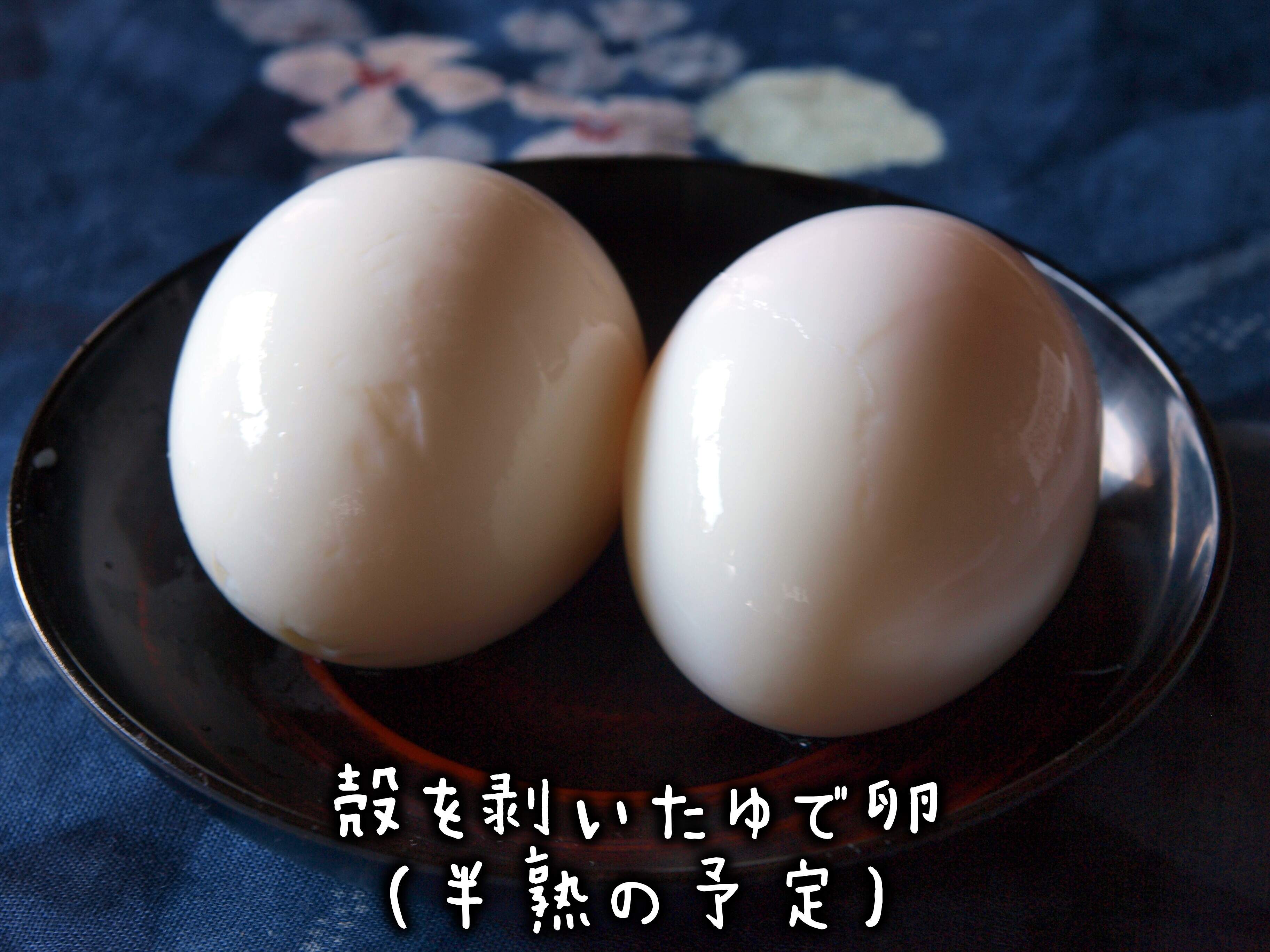まず、半熟ゆで卵を作る。 固ゆでもいいが、半熟のトロトロ感がたまらない。